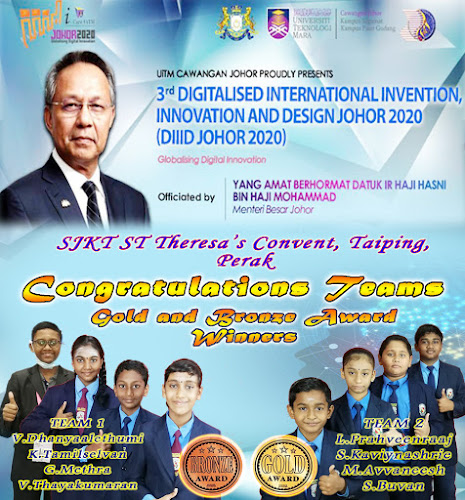 கடந்த 27.08.2020ஆம் நாள் ஜோகூர் மாநிலத்தில் ஏற்பாடு செய்யப்பட்ட 3வது அனைத்துலக அளவிலான இலக்கவியல் புத்தாக்க வடிவமைப்பு போட்டியில் (3rd Digitalized International Invention, Innovation and Design UITM Johor 2020) தைப்பிங், செயின்ட் திரேசா கான்வண்ட் தமிழ்ப்பள்ளி மாணவர்கள் இரு புத்தாக்கப் படைப்புகளை படைத்து,  தங்கம் மற்றும் வெண்கலப் பதக்கங்கள் பெற்று வெற்றி வாகை சூடி சாதனைப் படைத்துள்ளனர்.  Muri-Murid SJK(T) St.Theresas's, Taiping, Daerah LMS telah menang Pingat Emas & Pingat Gangsa dalam Pertandingan 3rd Digitalized International Invention, Innovation and Design UITM Johor 2020 Peringkat Antarabangsa Pada 27.08.2020 முதல் குழுவினர் வாகனம் ஓட்டும் தருணத்தில் ஏற்படும் சோர்வு நிலையைப் போக்க மூலிகை வழியில் அமைந்த நிவாரண யுத்தியை மாணவர்கள் பிரவின் லோகநாதன், பூவன் சுகுமாறன், கவினா ஸ்ரீ சங்கர் மற்றும் அவினாஷ் மனோகரன் ஆகியோர் படைத்தனர். இவர்களின் படைப்பு சிறந்த படைப்பாக அமைந்து தங்கப் பதக்கம் வென்று சாதனைப் படைத்தனர். இரண்டவது குழுவில் மாணவர்கள் தமிழ்ச்செல்வன் கனகநாதன், தான்யலெட்சுமி...
